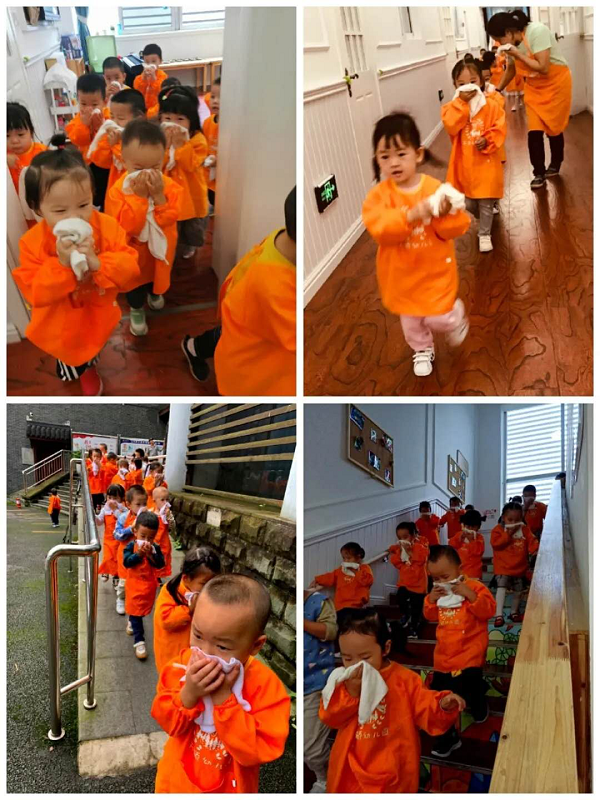 隨著幼兒園警報聲的拉響,消防安全應急演練拉開序幕。全體師生用濕毛巾捂住口鼻,彎著腰,按照應急疏散圖的路線有序撤離。疏散到安全地方后教師清點幼兒人數并向總指揮肖園長報告,本次活動“零走失,零意外,零受傷”。安全員趙應蓮對本次應急疏散演練進行現場提問,孩子們都爭先恐后的舉手回答。保安叔叔演示了滅火器正確使用方法,教師、孩子們認真學習并演練。