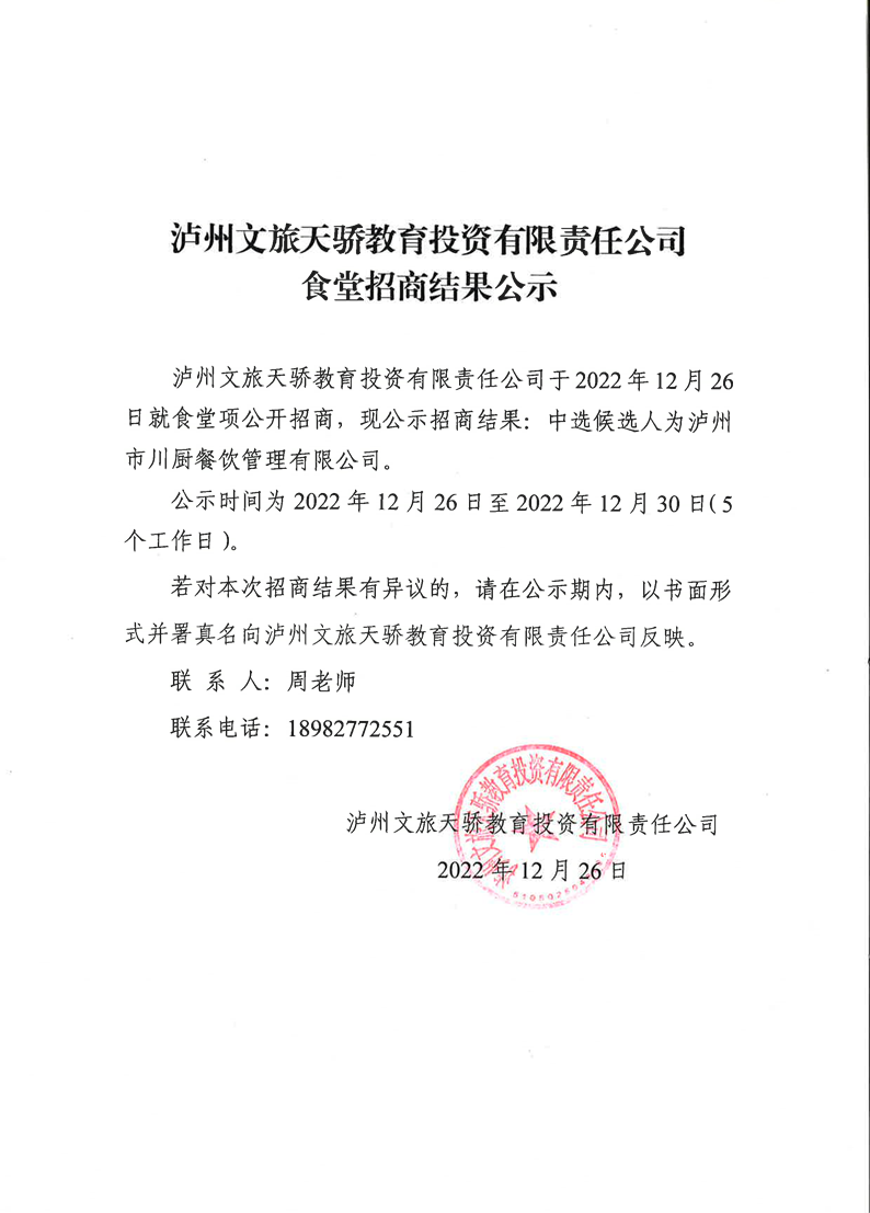 瀘州文旅天驕教育投資有限責任公司食堂招商結果公示