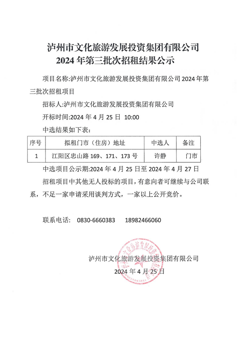 瀘州市文化旅游發展投資集團有限公司2024年第三批次招租結果公示