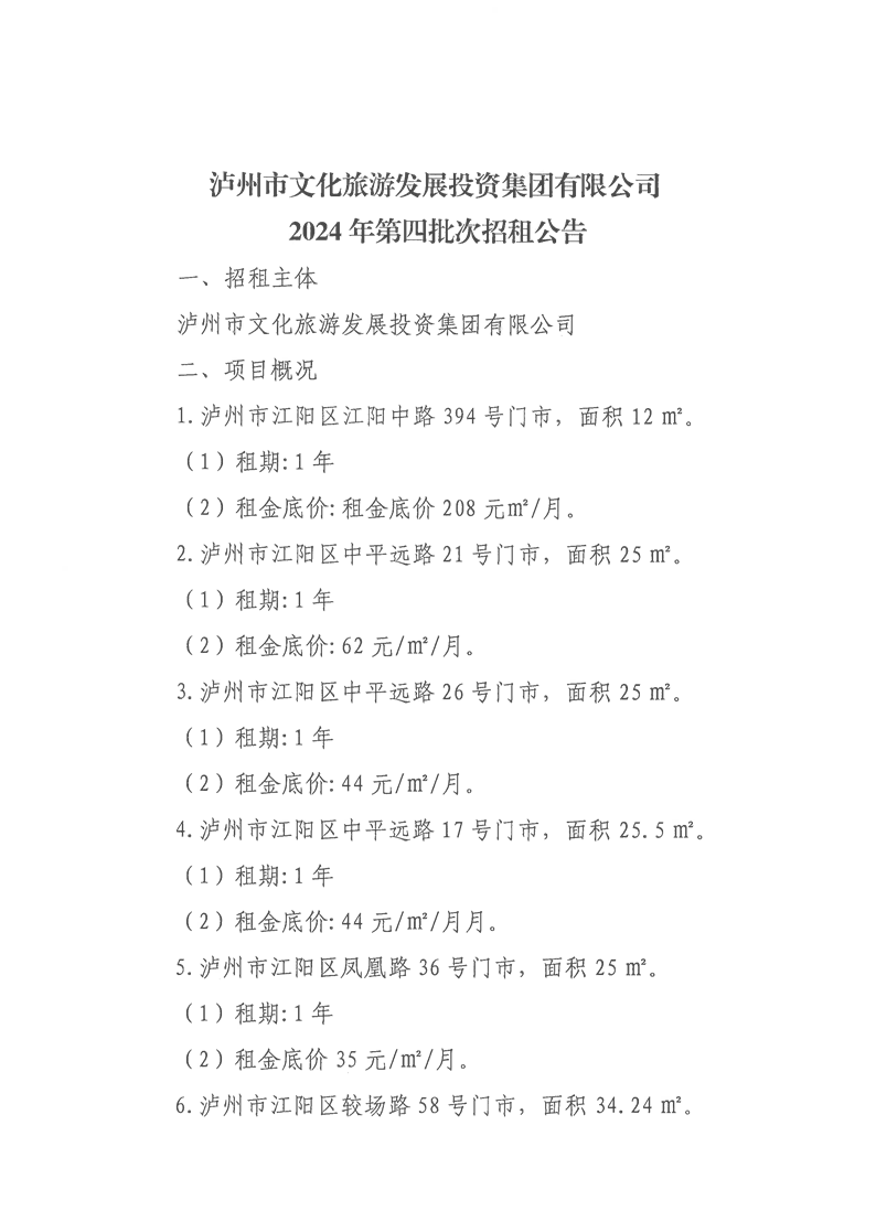 瀘州市文化旅游發(fā)展投資集團有限公司2024年第四批次招租公告