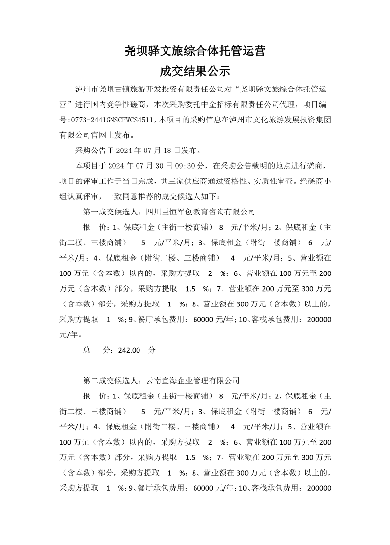 堯壩驛文旅綜合體托管運營成交結果公示