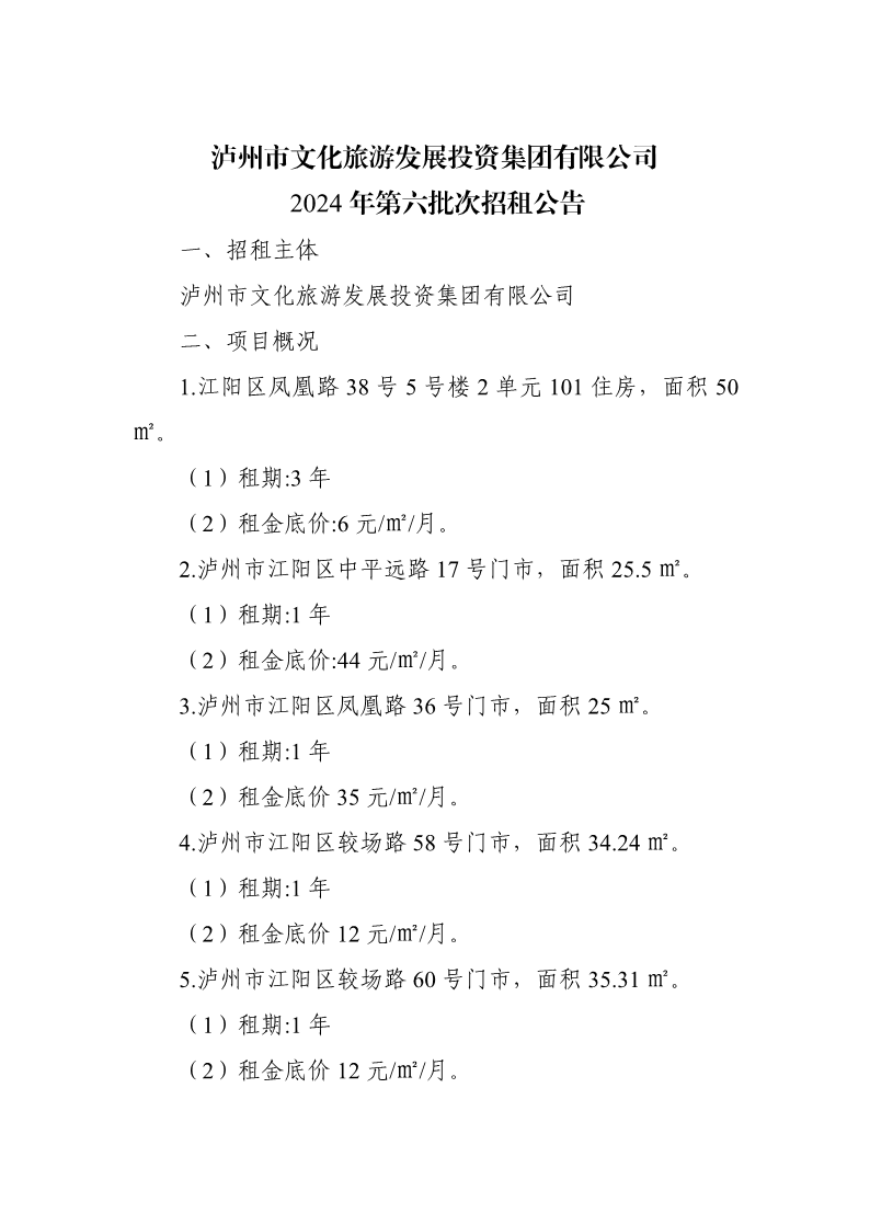 瀘州市文化旅游發展投資集團有限公司2024年第六批次招租公告