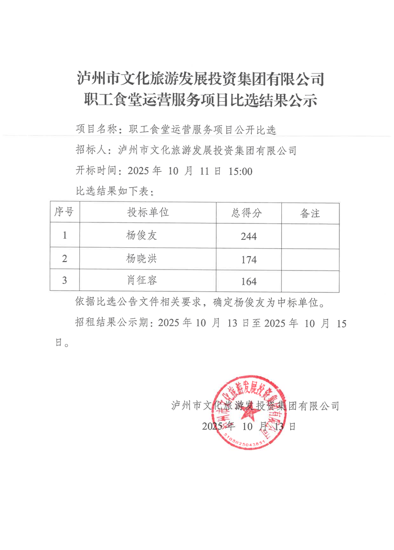 瀘州市文化旅游發展投資集團有限公司職工食堂運營服務項目比選結果公示