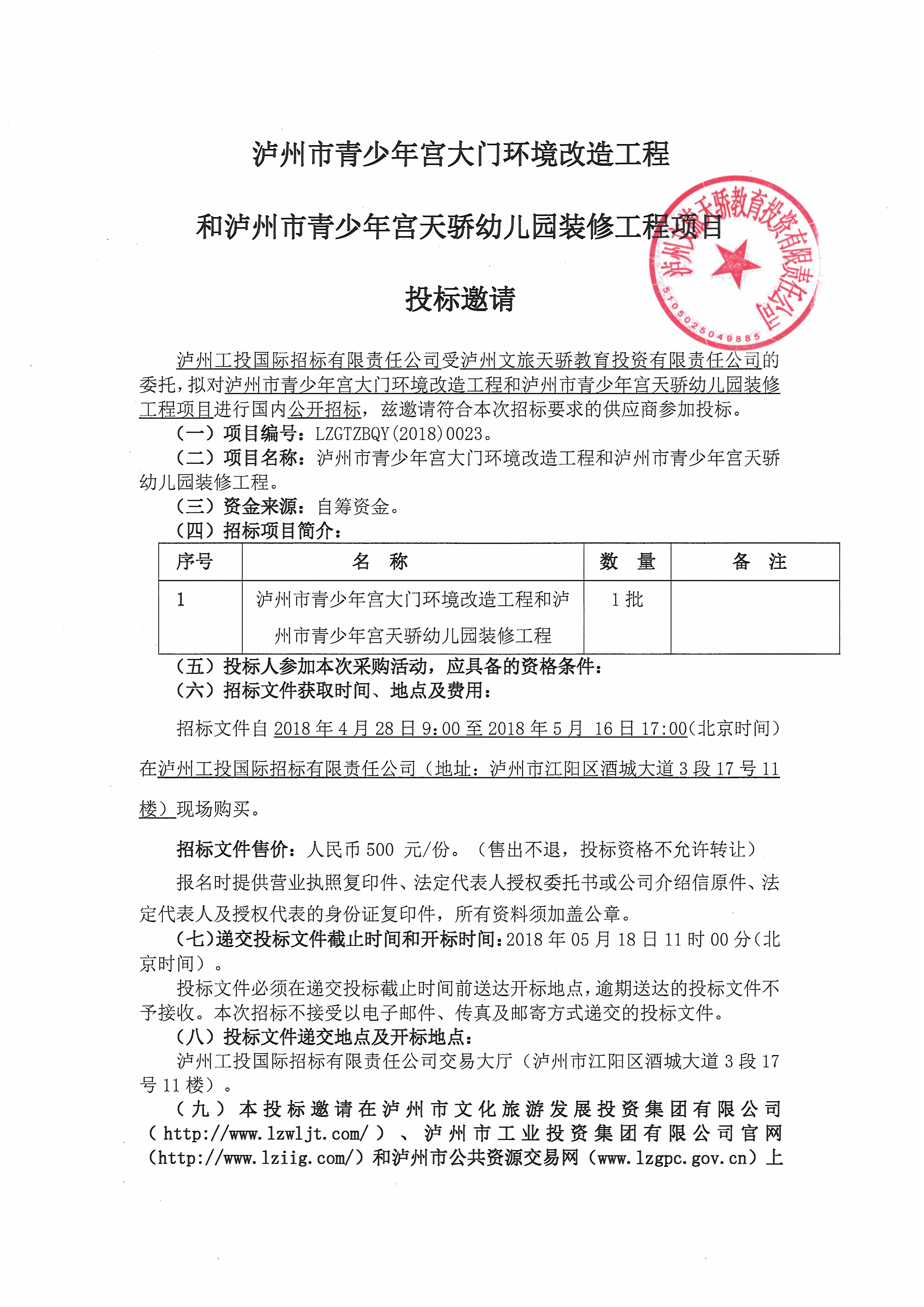 瀘州市青少年宮大門環(huán)境改造工程和瀘州市青少年宮天驕幼兒園裝修工程項目投標邀請