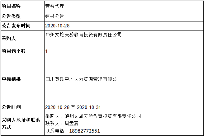 瀘州文旅天驕教育投資有限責任公司勞務代理競爭性談判結果公告