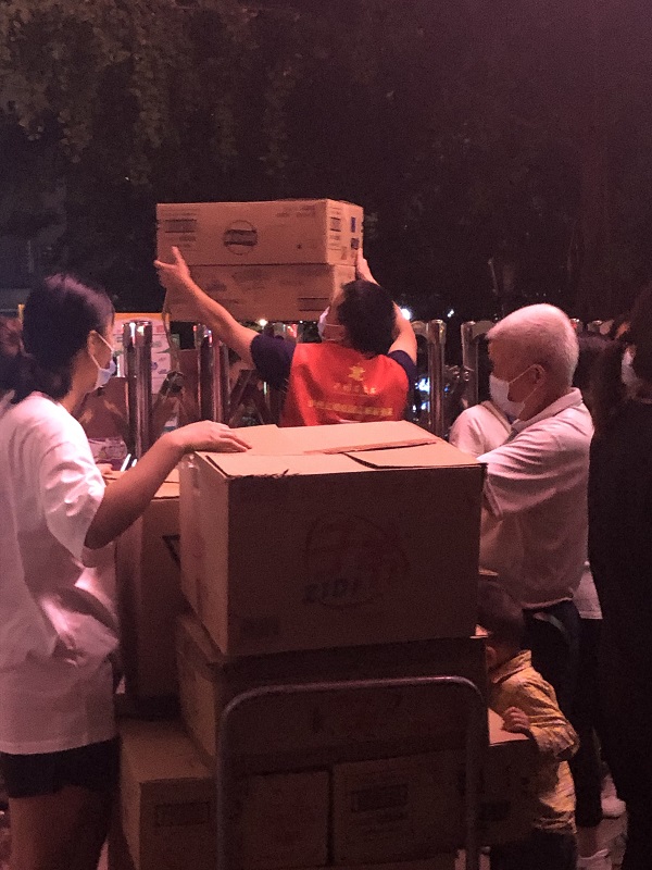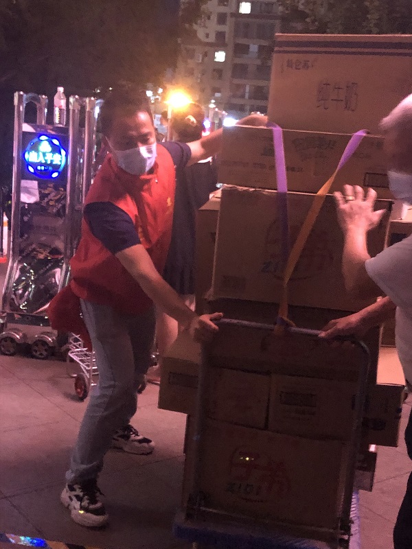 文旅集團下屬天翼公司黨員志愿者甘文壘在金色華庭小區幫忙搬運應急物資