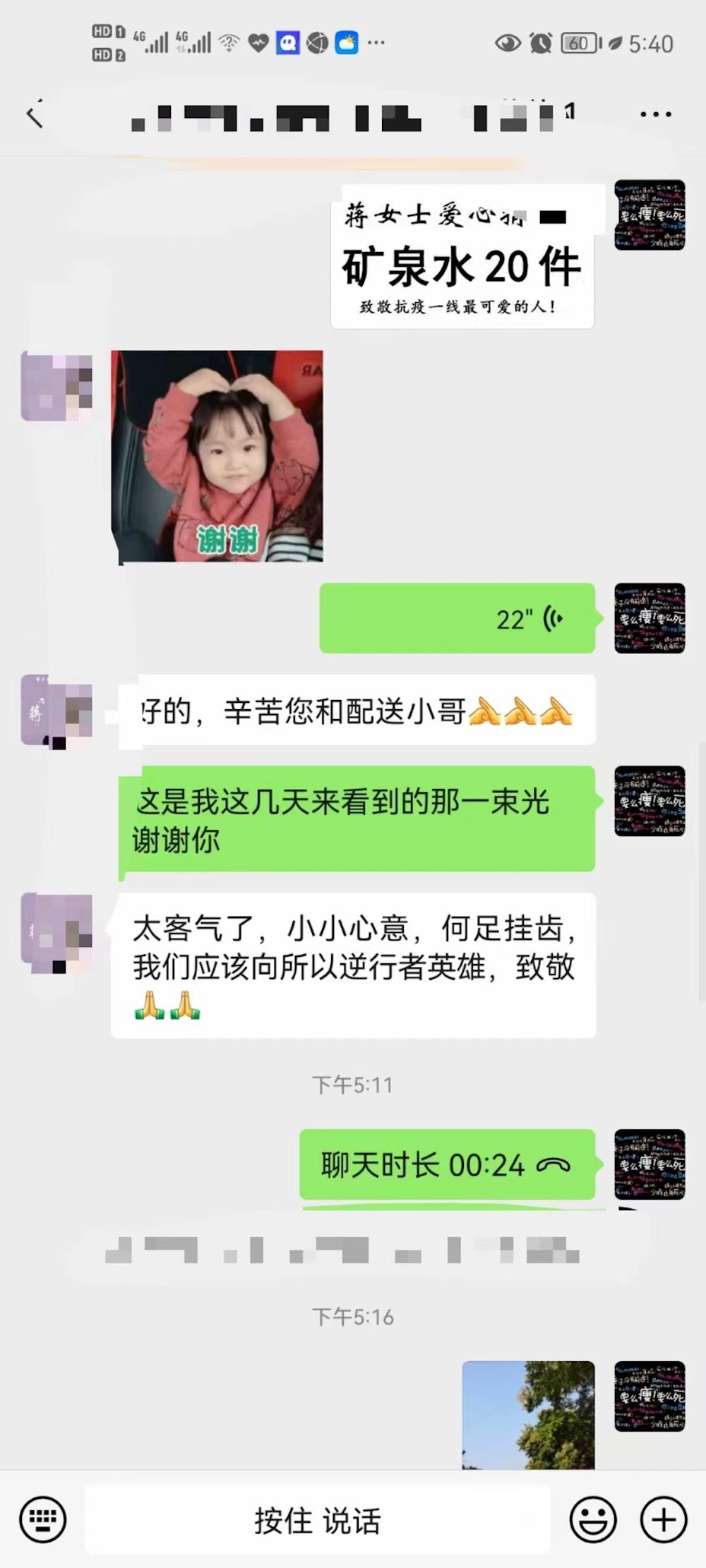 蔣佳住在高風(fēng)險區(qū)域“藍濱城”,因家里老人小孩無人照料,無法參與志愿服務(wù)。屬于封控區(qū)的她感動于各類抗疫一線最可愛人的辛勤付出,向社區(qū)捐贈了20件礦泉水,略表敬意。