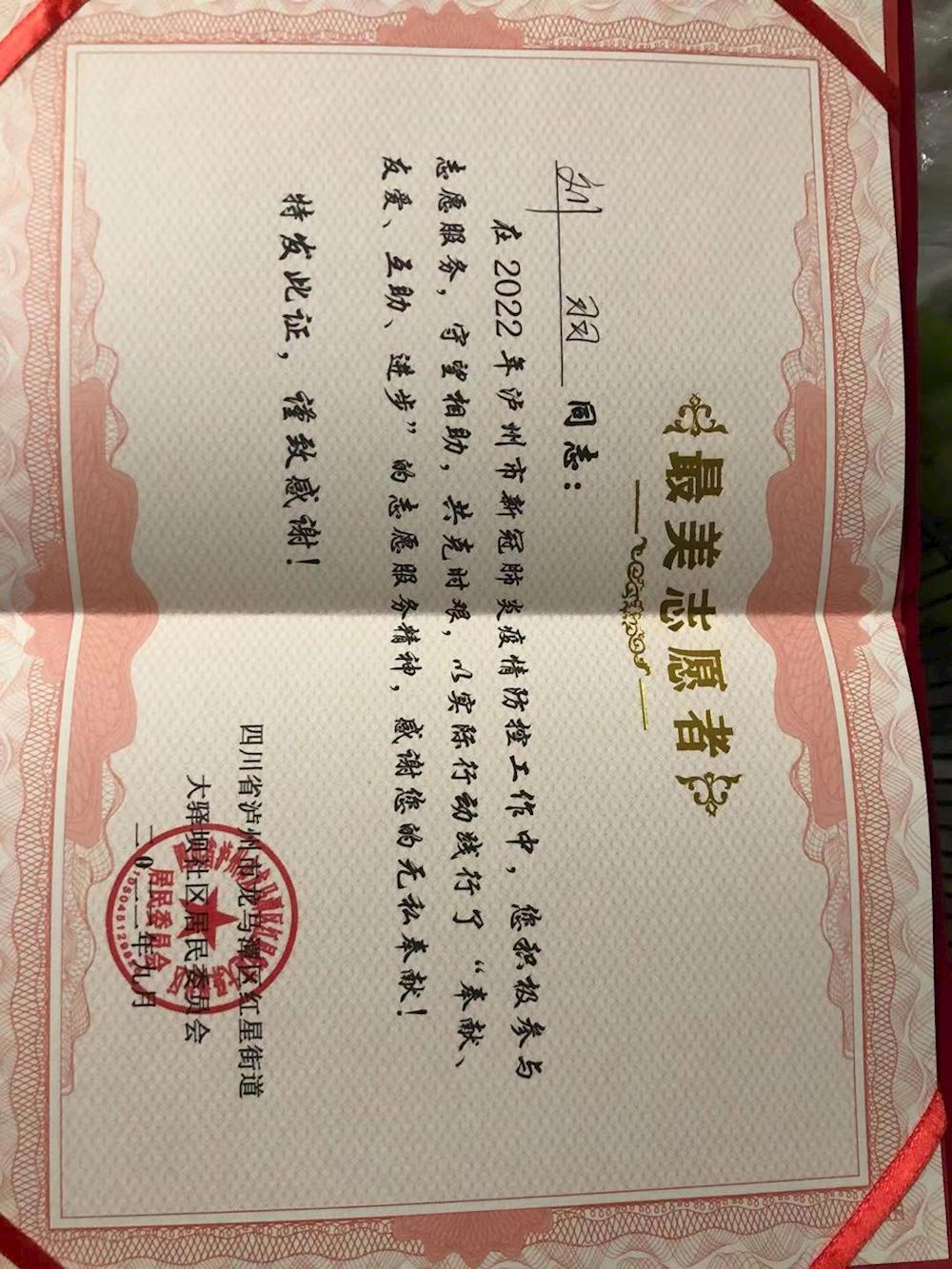 江陽區(qū)靜默管理后,胡楊積極響應(yīng),挺身而出,立即披上志愿紅,踴躍投入戰(zhàn)“疫”,就地轉(zhuǎn)化為小區(qū)志愿者,參與到小區(qū)通行卡發(fā)放、核酸檢測現(xiàn)場秩序維護等各項工作,憑借著耐心細致的服務(wù),贏得了鄰居們的一致好評。