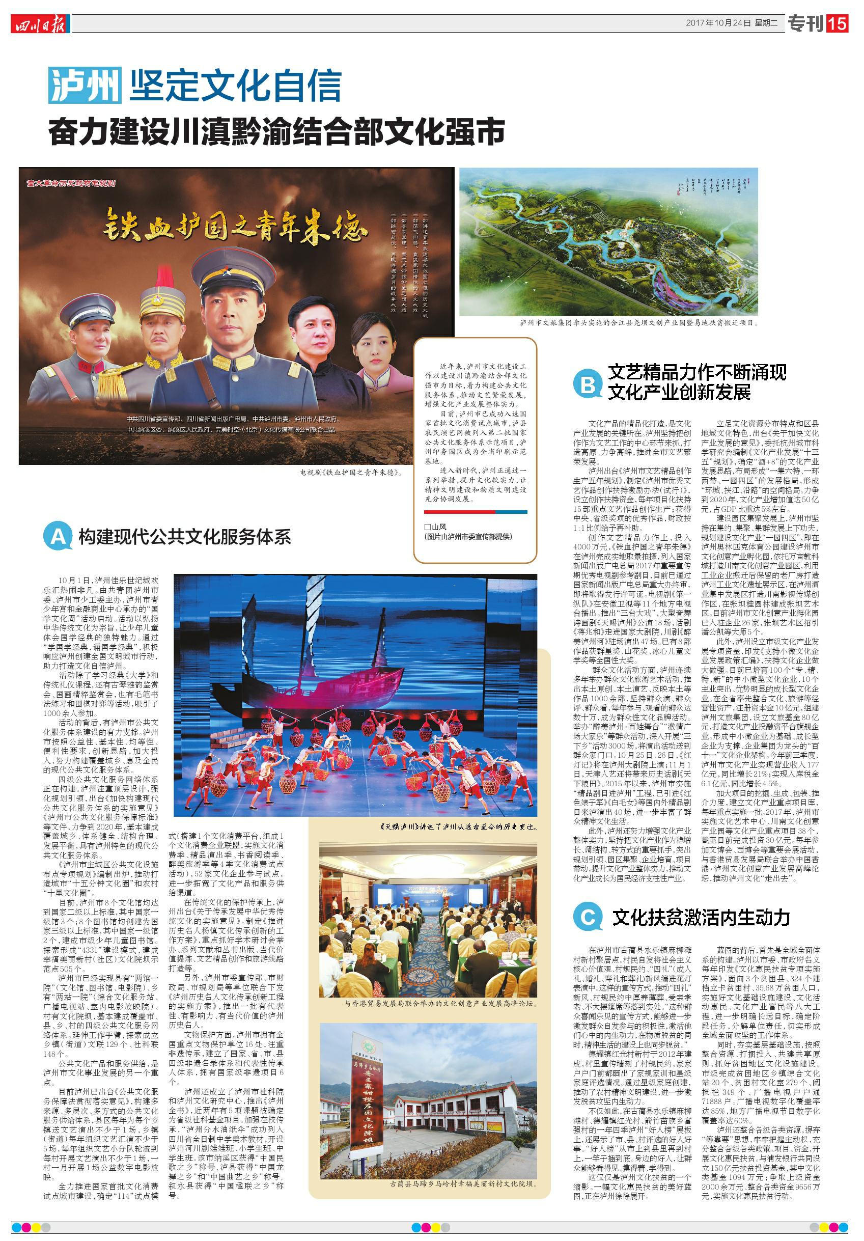 時逢十九大期間,10月 24日四川日報專刊發表了題為“瀘州堅定文化自信,奮力建設川滇黔渝結合部文化強市”的專版稿件。文中2次提及正在全速發展的瀘州文旅集團,并大板塊配圖(2張)瀘州文旅集團的項目。瀘州文旅集團作為新成立的國資號文化企業,正按照市委、市政府“三化”要求加快轉型、加快發展,用新的業績,新的面貌貫徹落實習總書記十九大報告精神。